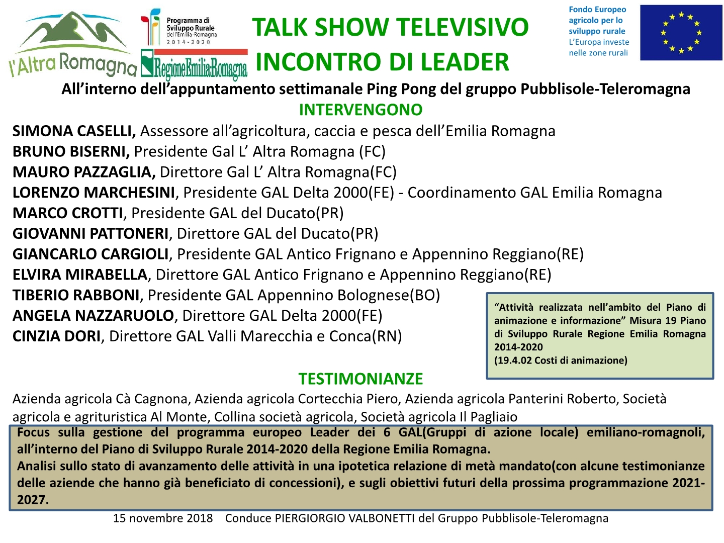 SEGUITECI NUMEROSI AL TALK SHOW TV “INCONTRO DI LEADER” INSIEME ALL’ASSESSORE REGIONALE CASELLI E AI GAL DELL’EMILIA ROMAGNA
