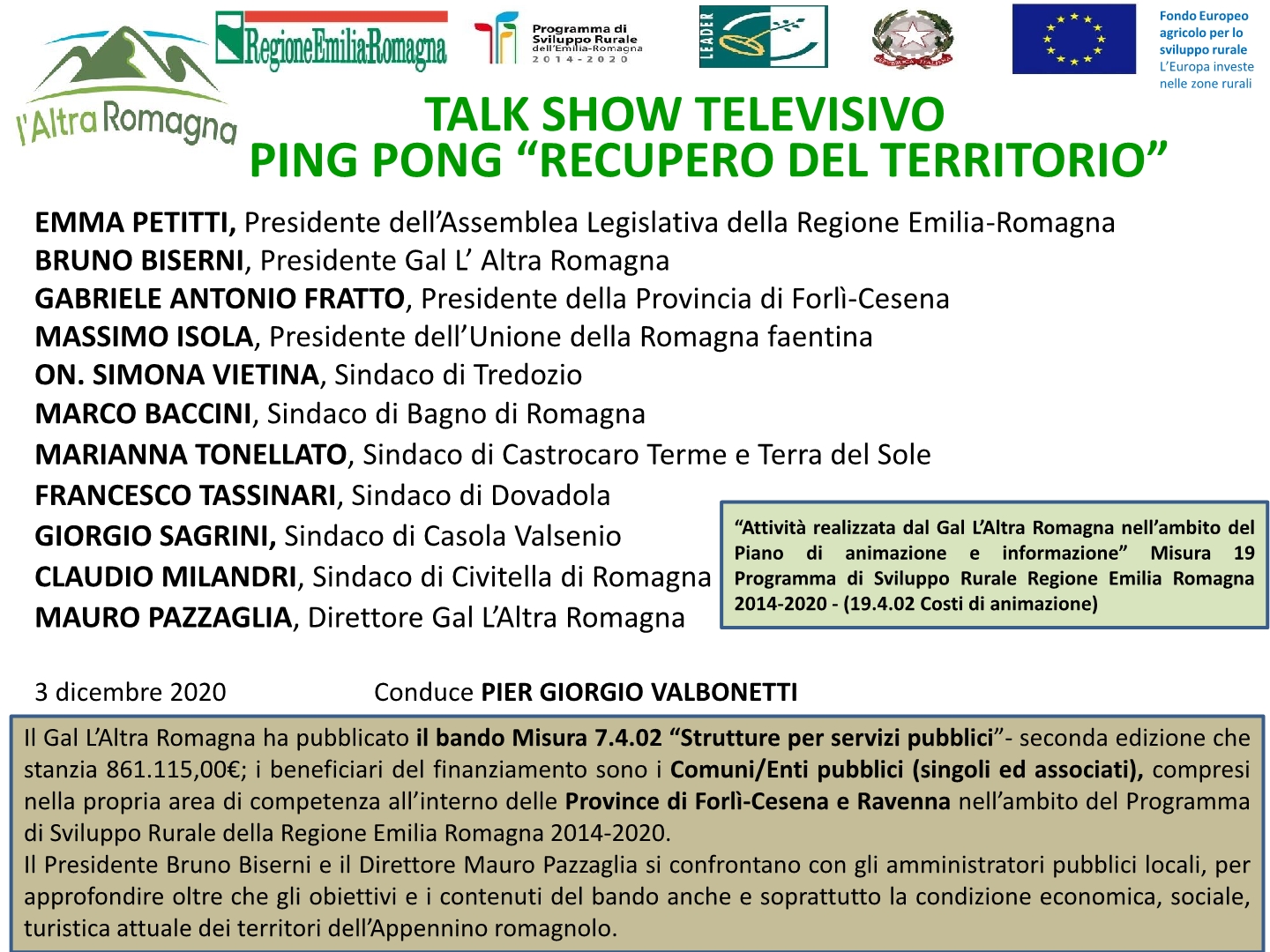 Il Gal L’Altra Romagna organizza il talk show televisivo “Recupero del territorio” all’interno dello spazio settimanale Ping Pong del gruppo Pubblisole-Teleromagna condotto
