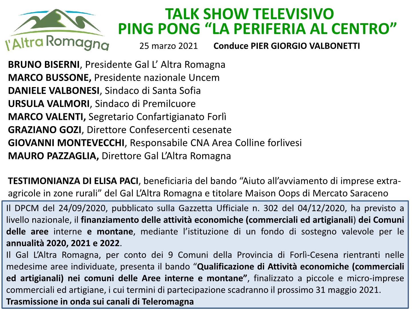 Il Gal L’Altra Romagna, rappresentato dal Presidente Bruno Biserni e dal Direttore Mauro Pazzaglia, organizza negli studi di Teleromagna il talk show televisivo Ping Pong “La p