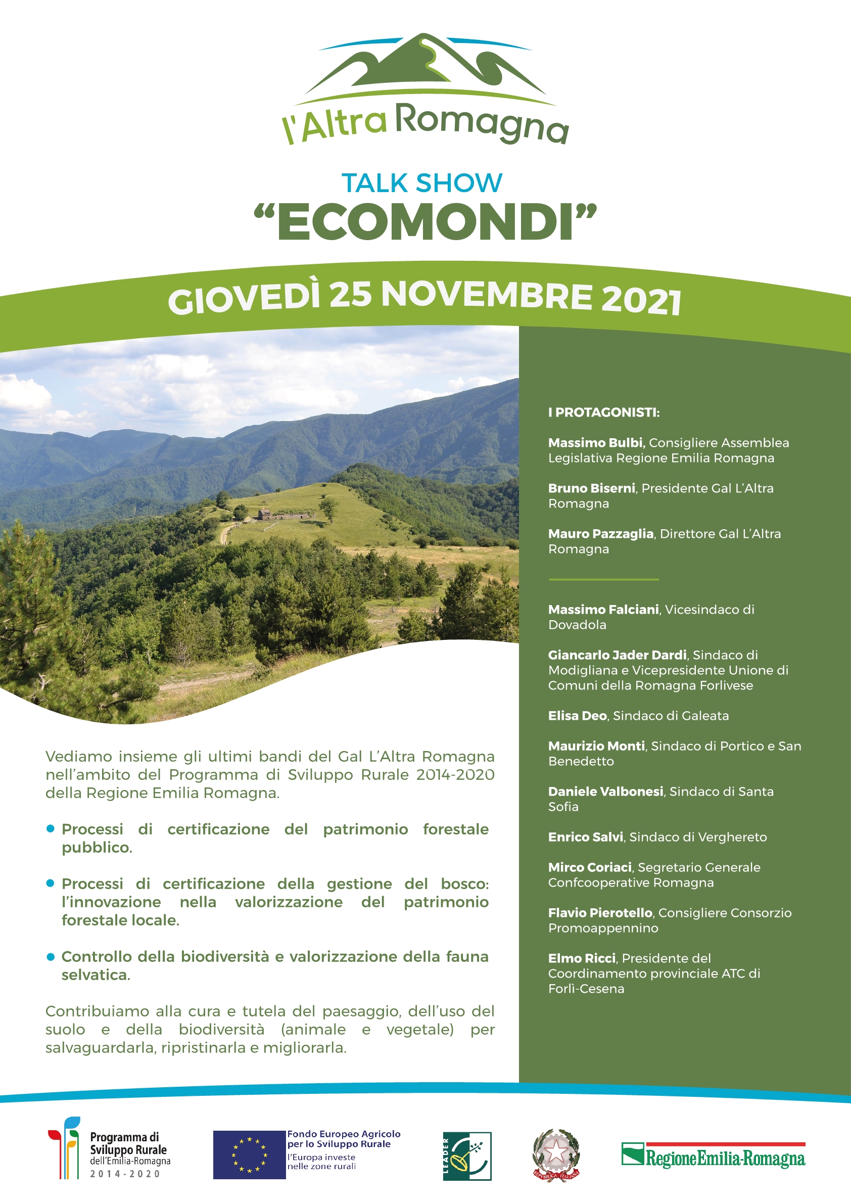 Fitto elenco di protagonisti al talk show organizzato dal GAL L’Altra Romagna sulle tematiche del patrimonio forestale pubblico e locale, e sulla valorizzazione della fauna selva