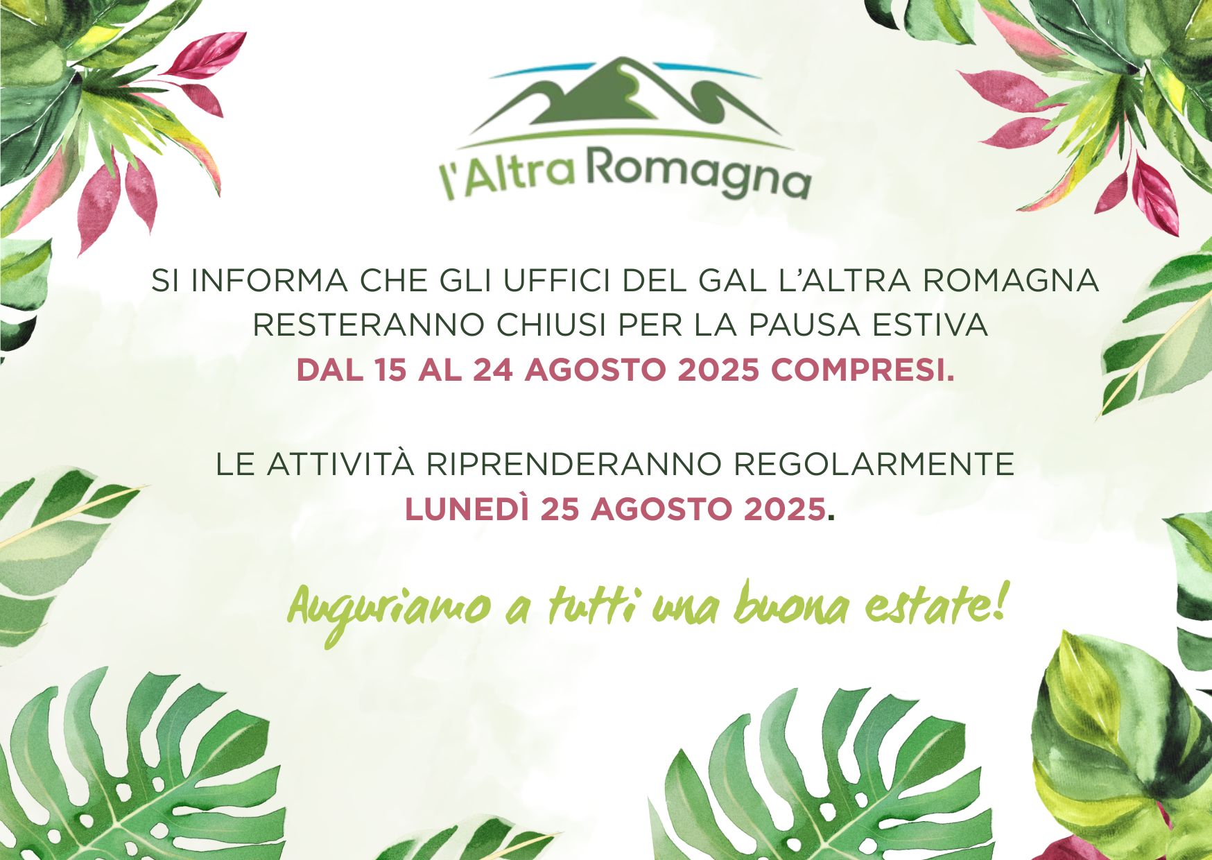In occasione della pausa estiva, anche il GAL L’Altra Romagna si prende qualche giorno di riposo.Gli uffici resteranno chiusi dal 15 al 24 agosto 2025 compresi, per riaprire lune